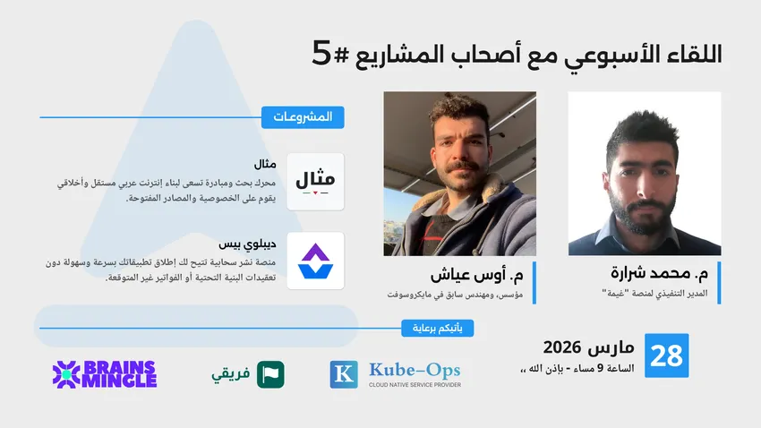 تناول اللقاء التعريف بالمتحدثين ومسيرتهم في بناء مشروعات تقنية عربية، مع استعراض مشروعي "مثال" و"ديبلوي بيس" من حيث الفكرة والرؤية والتحديات التي واجهت كل مشروع، خاصة في الجوانب التقنية مثل البنية التحتية، أنظمة النشر التلقائي، وإدارة التكلفة.